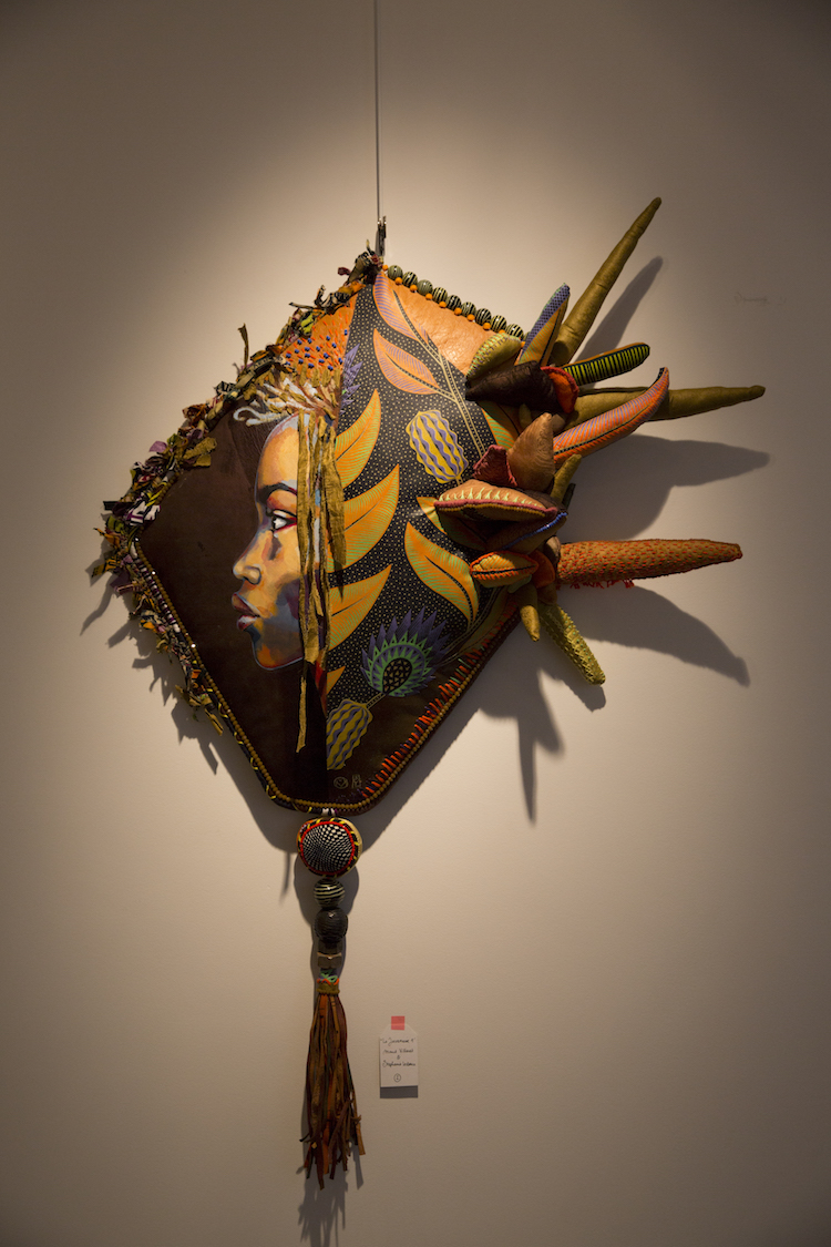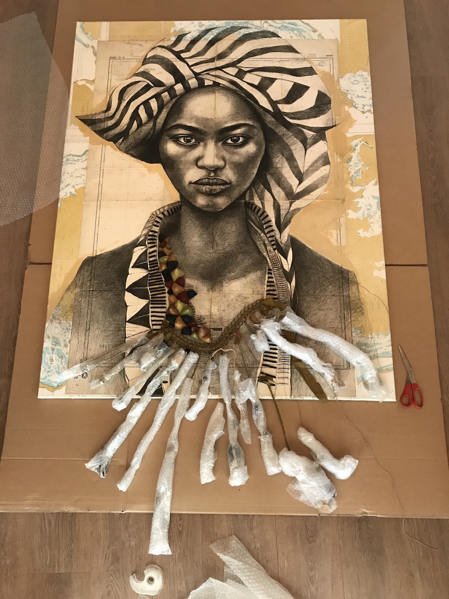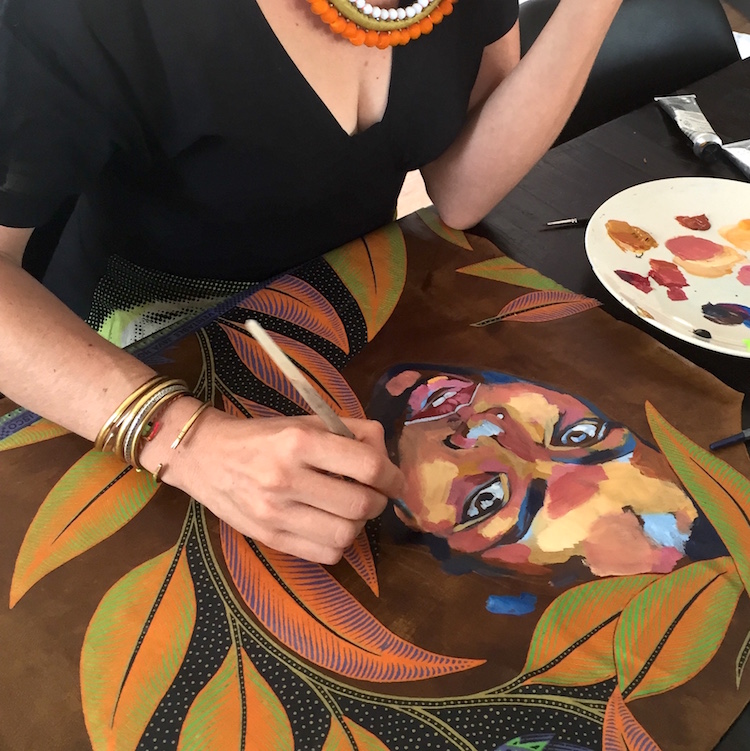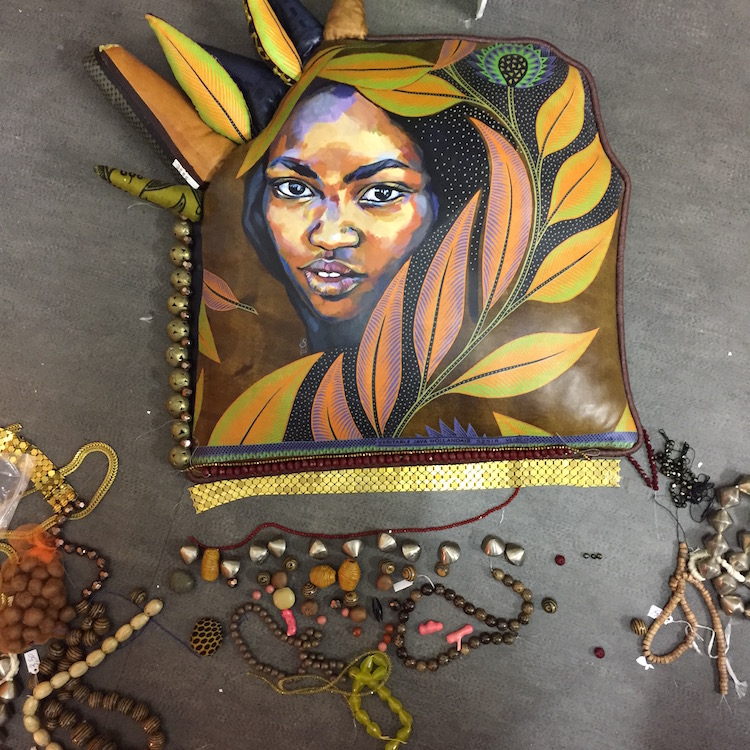 Elle brode avec des bandes de tissu bazin, entoure l'objet d'un cordon de wax, on ne l'arrête plus !