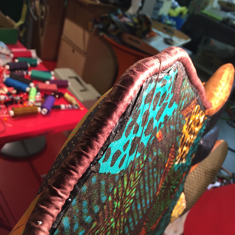 Les Javanaises sont parmi les objets les plus "bizarres" qu'on ait exposés... Ni vraiment tableaux, ni vraiment coussins, c'étaient des objets hybrides où notre mélange d'univers s'est exprimé de la façon la plus fantasque, sans souci de faire quelque chose d'existant, simplement guidées par le plaisir de créer.