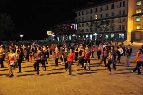 On a séjourné à Xinjie, dans le Yunnan. C'est une région de minorités ethniques et tous les soirs, sur la place du village (comme dans beaucoup d'endroits en Chine), il y a des danses collectives ! Un moment de convivialité incontournable. Musique plus ou moins kitsch dans des enceintes criardes... et ce que j'ai aimé, c'est la foule que ça draine : toutes les minorités du coin s'y retrouvent, et surtout, toutes les générations ! Des jeunes un peu fashion, comme des mamies en costume tradi, remarquablement souples pour leur âge... On a même été invitées à participer, intégrées dans la ronde géante, singeant comme on pouvait des chorégraphies qu'on ne connaissait évidemment pas !
